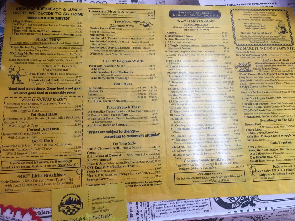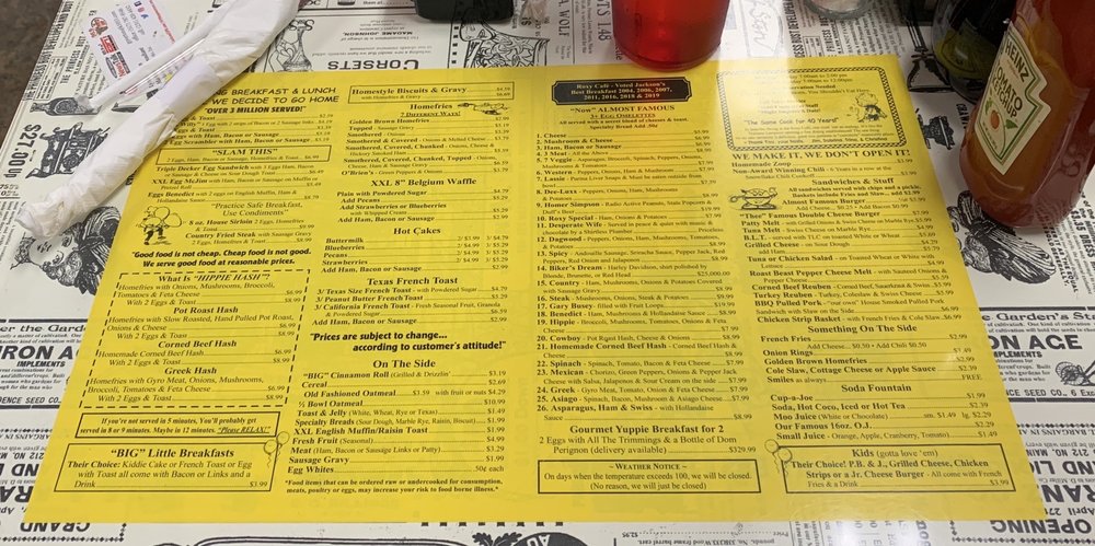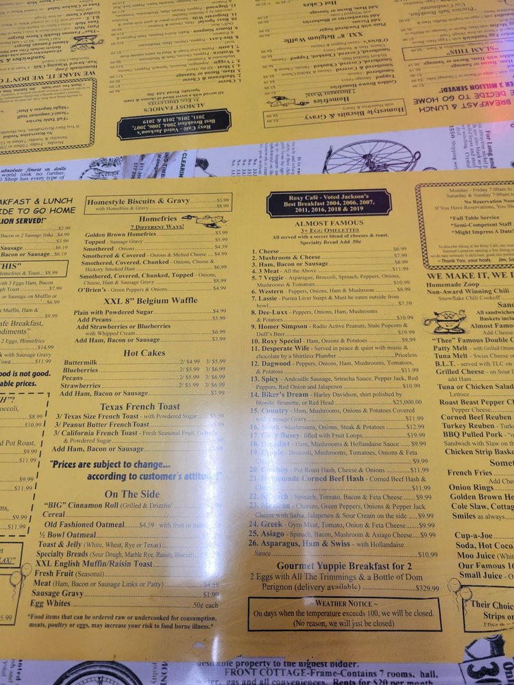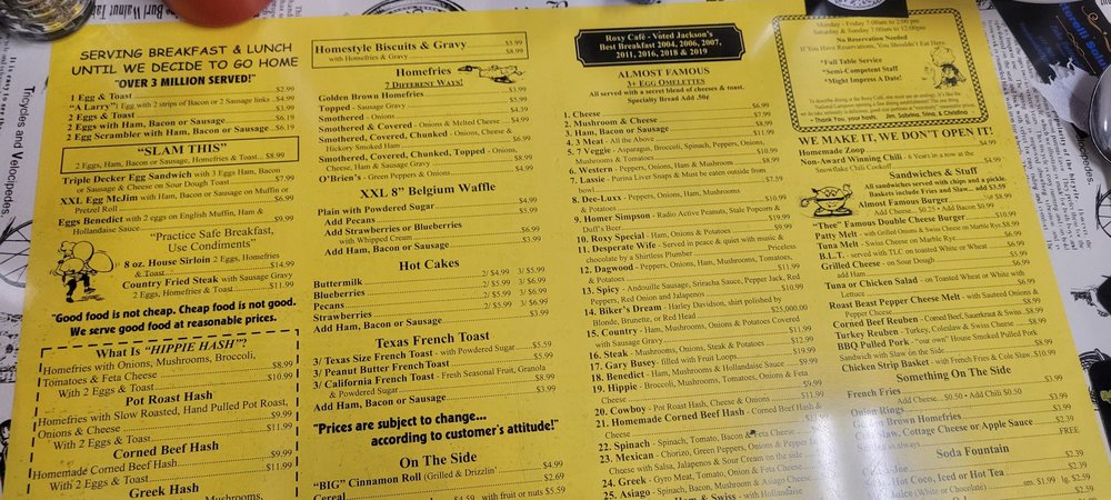 Introducing the menu at Roxy Cafe! Located in Jackson, MI, Roxy Cafe is a top spot for breakfast and brunch lovers. Offering a range of delicious options like the Triple Decker Egg Sandwich, Almost Famous with ham, bacon, and sausage, and Homefries with smothered toppings, Roxy Cafe has something to satisfy every craving. The cozy diner atmosphere combined with friendly service makes for a delightful dining experience. Customers rave about the huge portions, friendly staff, and the overall inviting ambiance. With a diverse menu, reasonable prices, and excellent service, Roxy Cafe is a must-visit for those seeking a memorable breakfast or brunch experience.